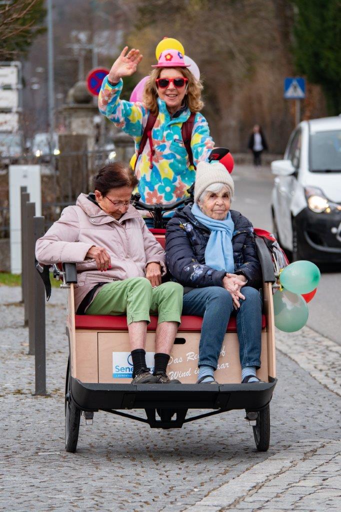 Anschließend ging es für zwei Bewohnerinnen, Frau Ehrenbrandtner und Frau Henn, mit der ehrenamtlichen Rikschafahrerin Veronika Lattner zur Schlüsselübergabe bei der Stadt. Bei strahlendem Sonnenschein und inmitten der bunten Faschingsgesellschaft erlebten die Seniorinnen einen unvergesslichen Ausflug.