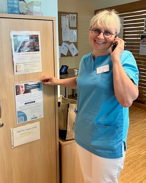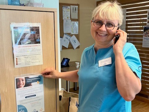 Wohnbereichsleitung Barbara Groinig mit dem neuen Poster zum Thema Whistleblower-Schutz