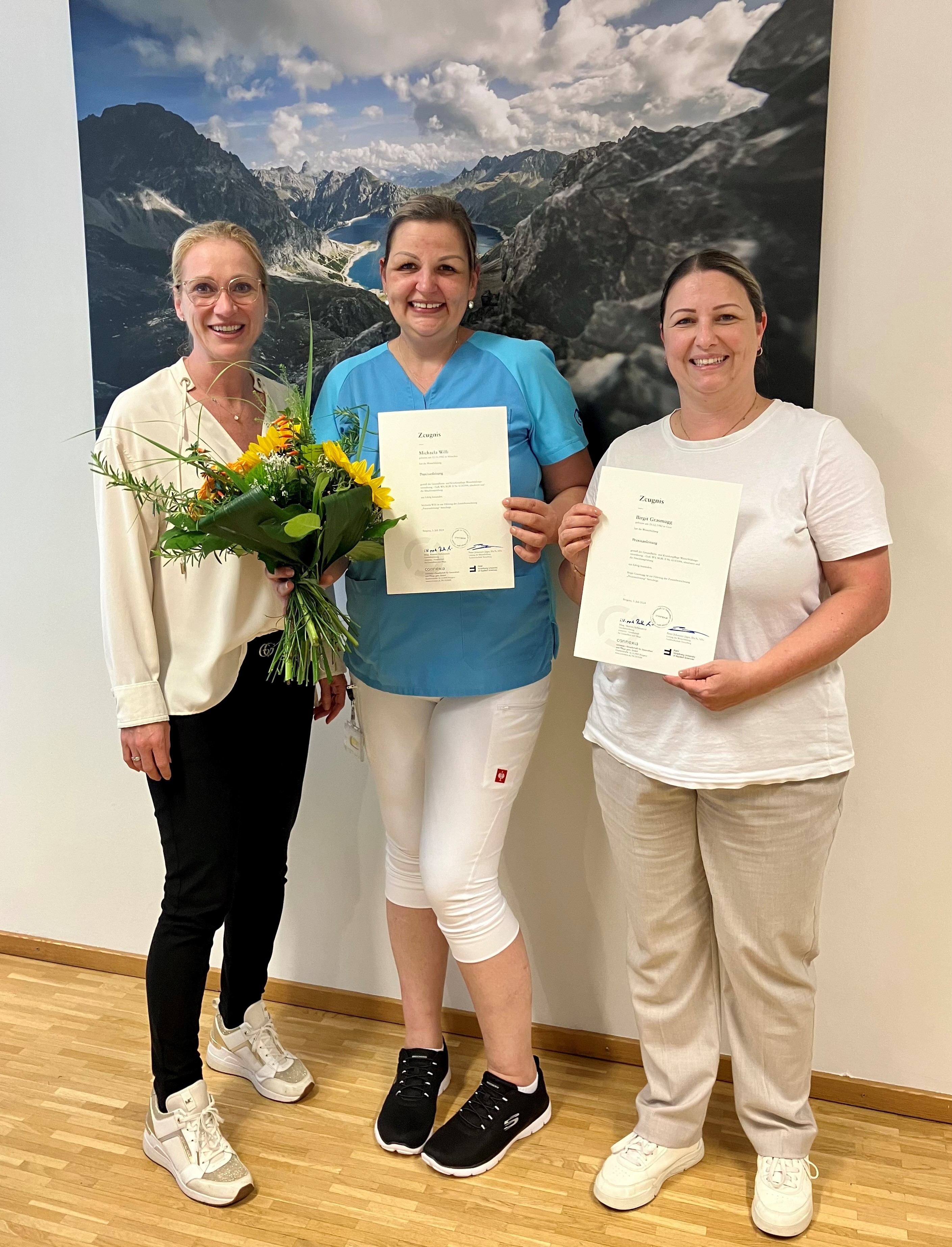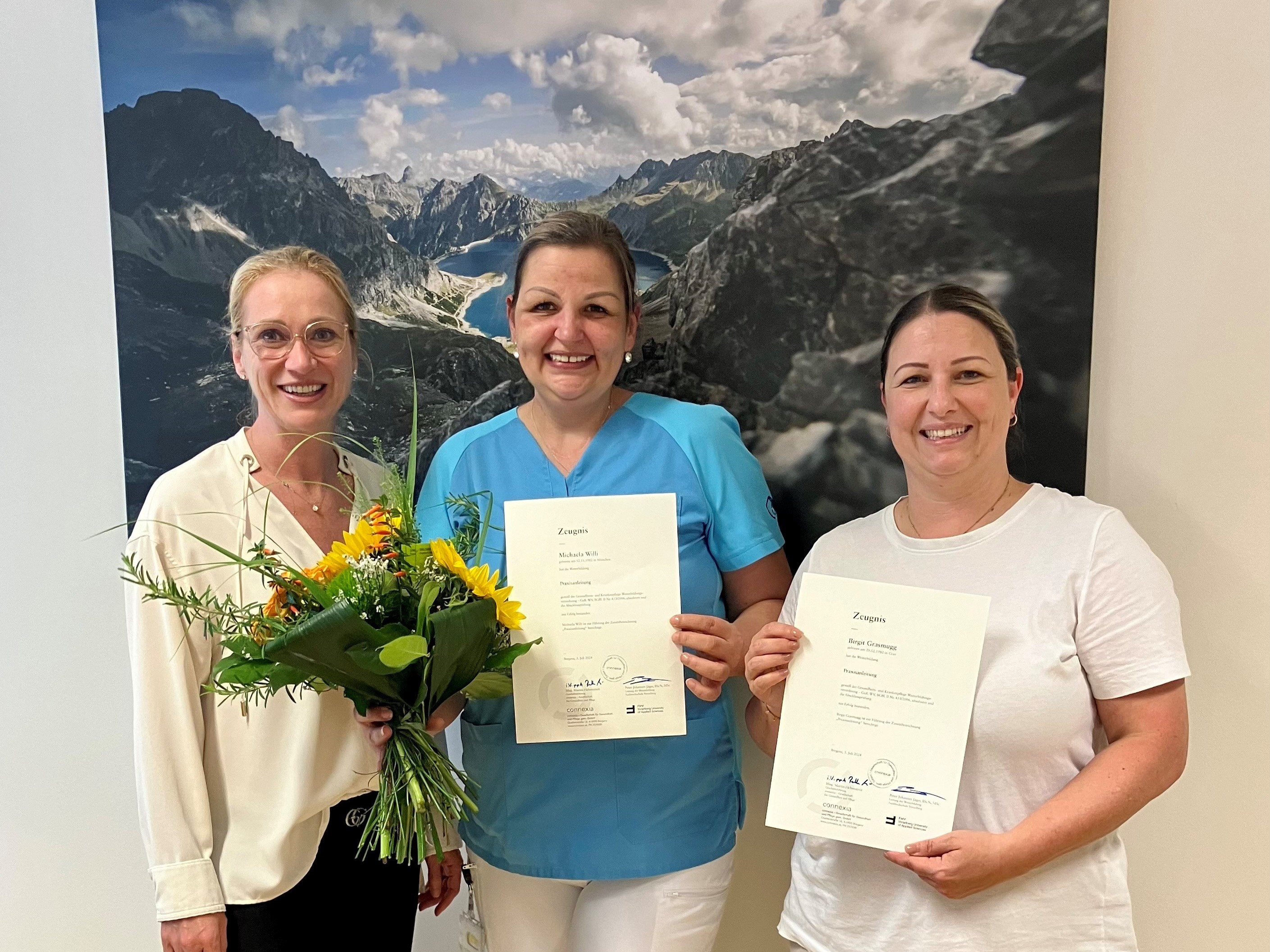 Im SeneCura Laurentius-Park Bludenz konnte kürzlich ein Ausbildungsabschluss gefeiert werden. Michaela Willi und Pflegedienstleitung Birgit Grasmugg absolvierten den Kurs „Praxisanleitung kompakt“. Das gesamte Team des Hauses gratulierte sehr herzlich zum Kursende. „Mit der steten Weiterentwicklung der Praxisanleitung auf unterschiedlichen Ebenen stellen wir als Einrichtung und die Organisatoren im Auftrag des Landes Vorarlberg wichtige Weichen, um talentierte Menschen für Pflege- und Betreuungsberufe zu gewinnen.“, so Hausleitung Helga Sartori. Die beiden Absolvent:innen freuten sich über den Abschluss: „Wir sind stolz unser Wissen und Erfahrung an die zukünftigen Kolleg:innen professionell weitergeben zu können“, so Michaela Willi und Birgit Grasmugg.