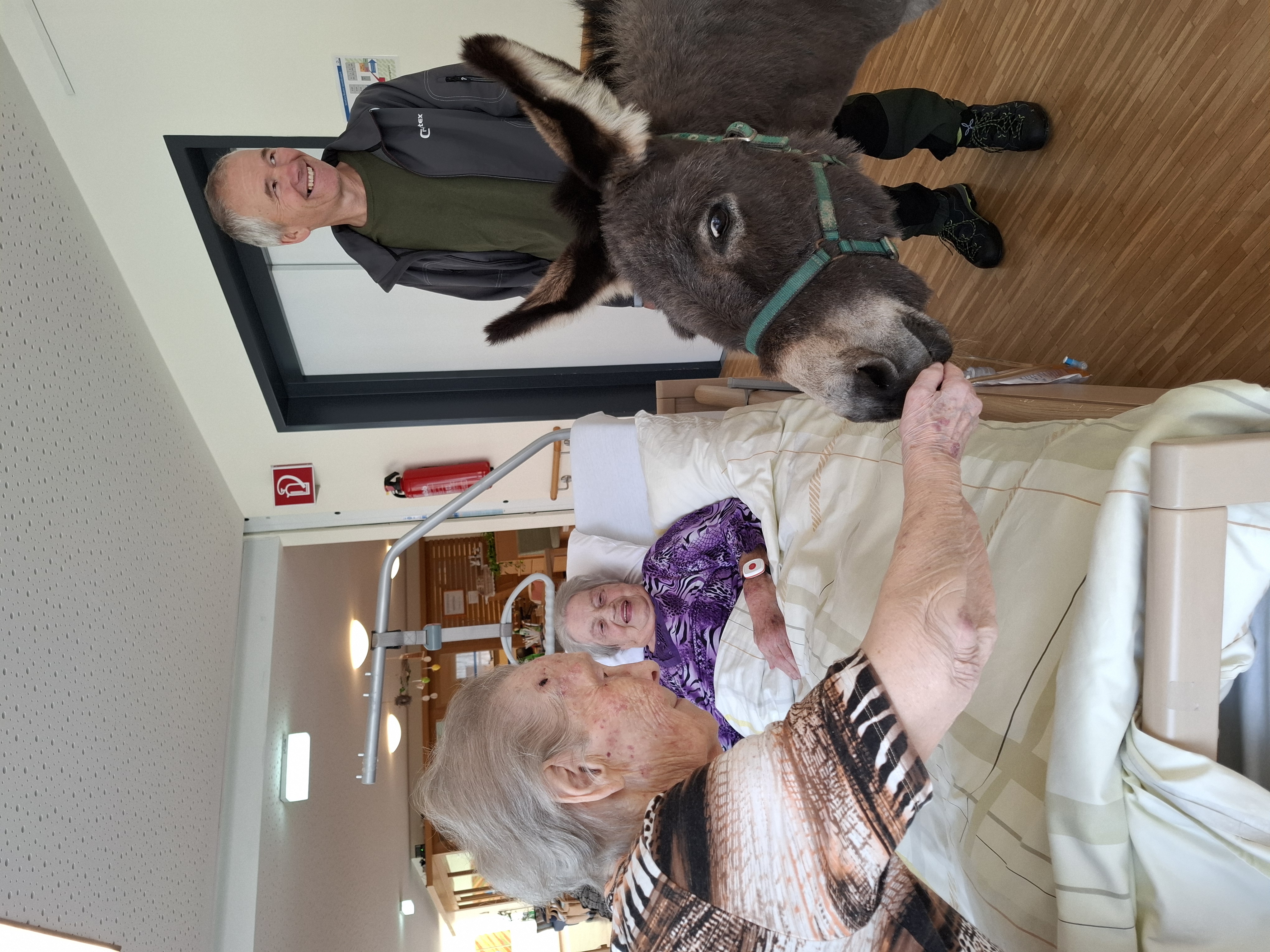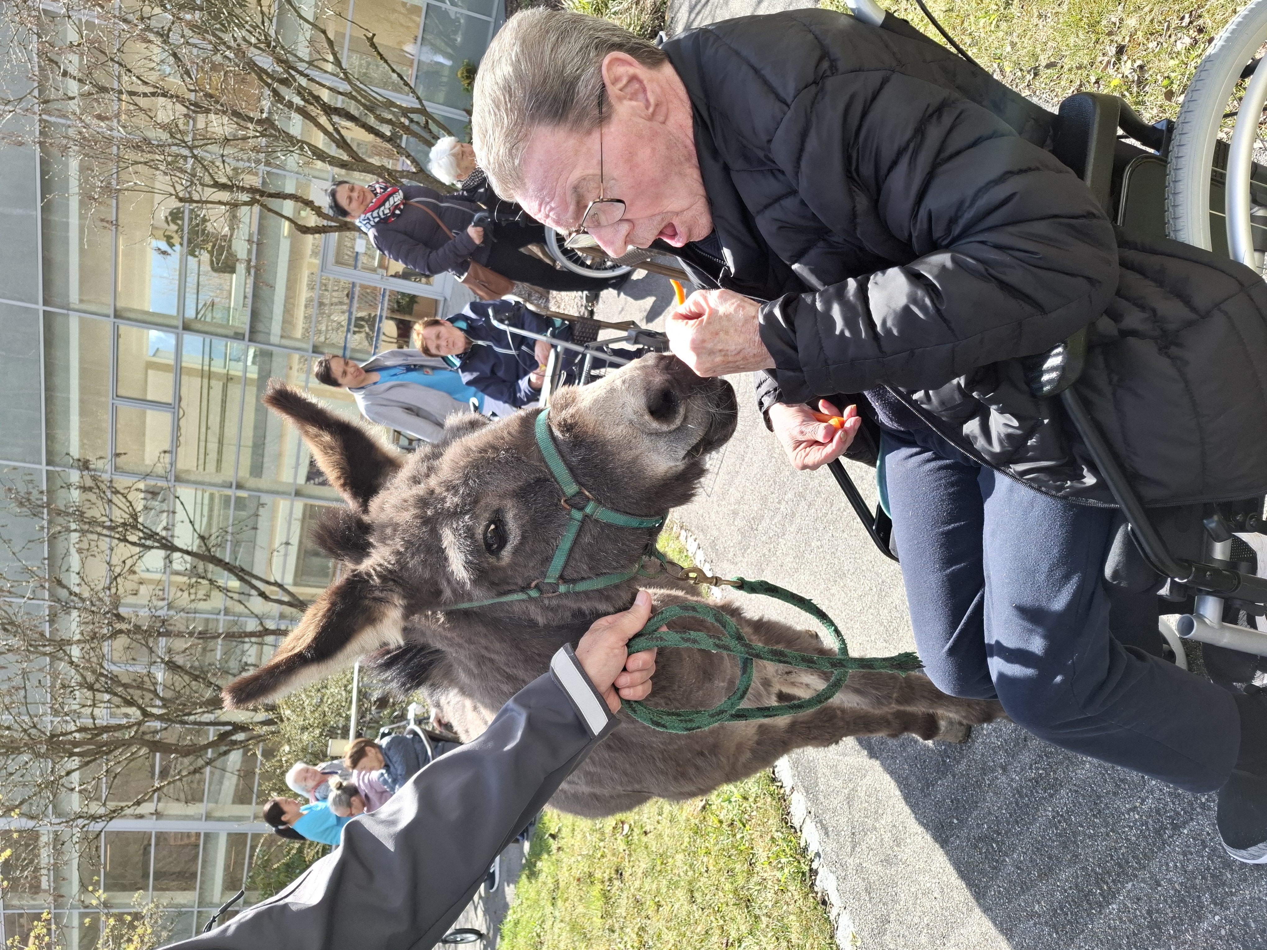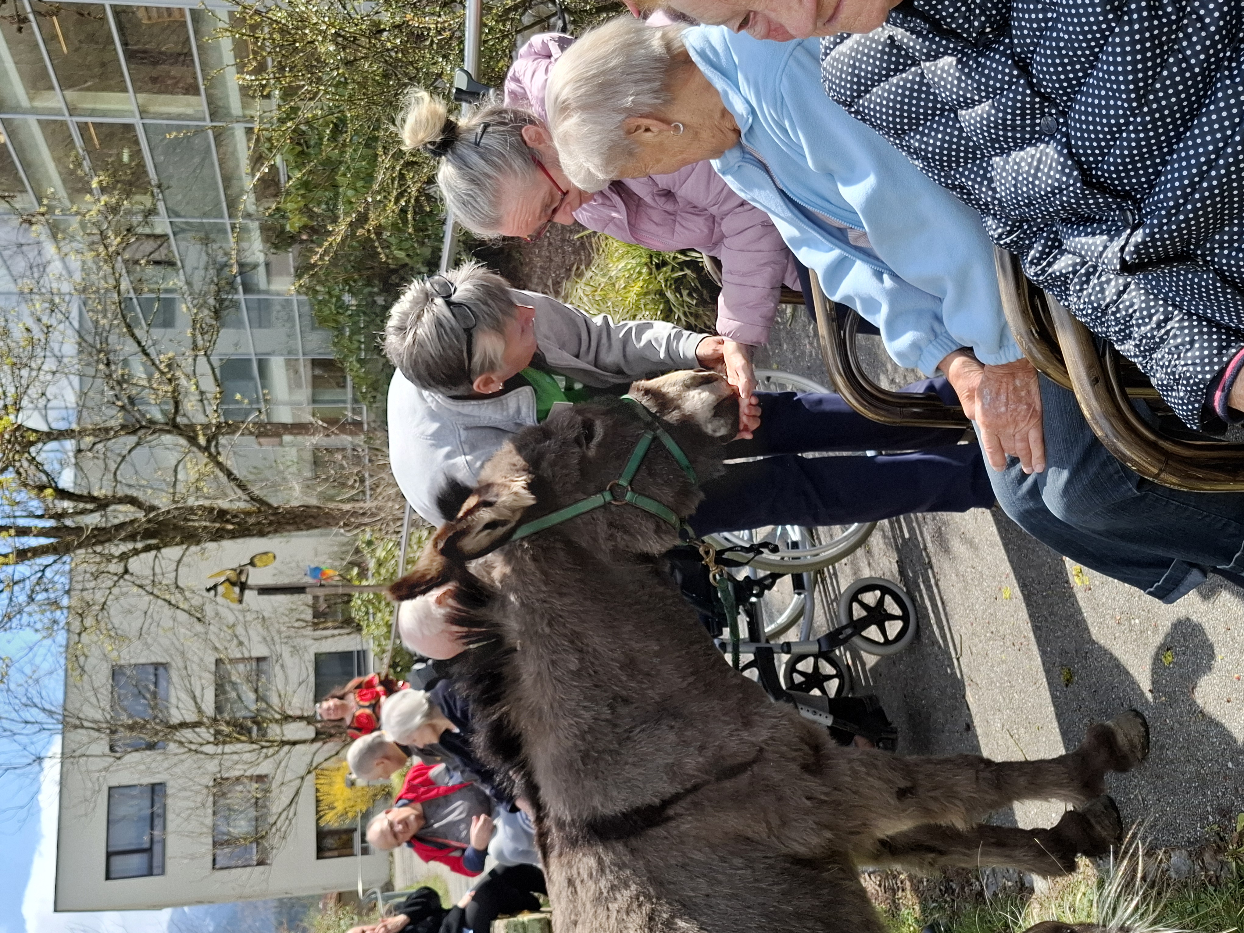 Der Besuch von Tieren ist immer ein Highlight für die Bewohner:innen des SeneCura Laurentiuspark Bludenz. So auch am Karfreitag als Elsa und Maya vorbeischauten. Allein der Anblick der beiden Esel zauberte allen ein Lächeln ins Gesicht. Gerne ließen sie sich mit Äpfeln und Karotten füttern. Besonders der Ausflug in den Wohnbereich sorgte für Begeisterung. Ein wunderbares Erlebnis für alle!